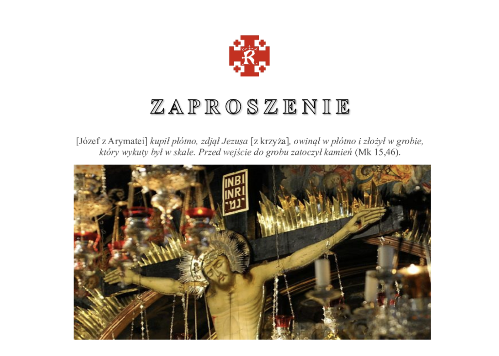 Zarząd Okręgowy Polskiego Związku Łowieckiego w Krakowie informuje, że jak co roku, za pośrednictwem Komisji Promocji Łowiectwa ZO PZŁ Kraków, do naszego środowiska zostało skierowane zaproszenie od Komisarza Ziemi Świętej w Polsce – do udziału w Jerozolimskim Misterium Pogrzebu Pana Jezusa.